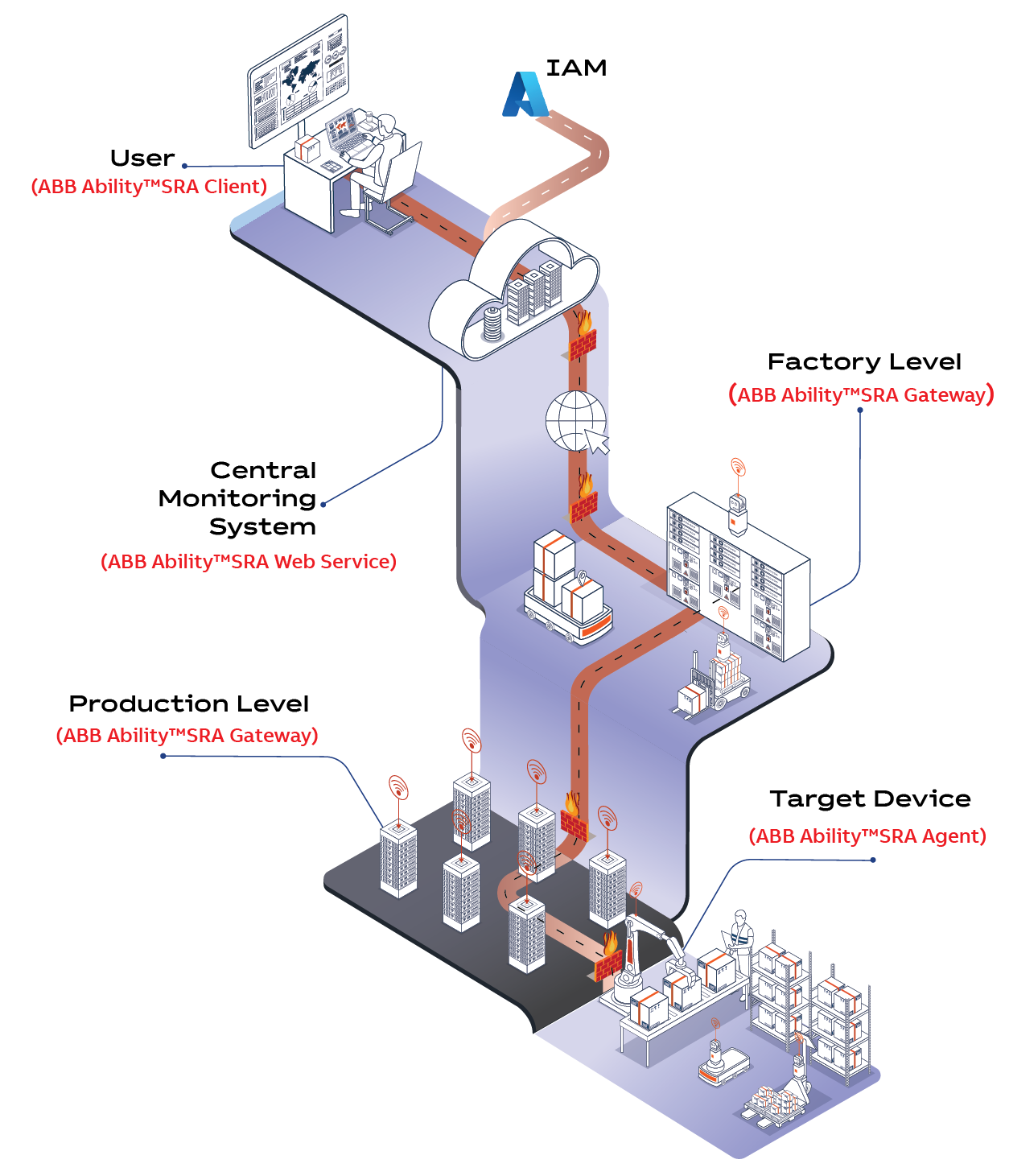 In case the target device is not capable of an IAM connection to verify user authentication, the ABB Ability™ SRA agent can handle the task and also the role-based access control. This enables security implementation for legacy devices.