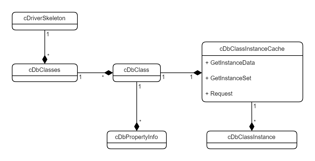 driver.Classes[“ClassName”]ascDbClass) contains a collection of properties (class.PropertiesascDbPropertyInfo[]) and a class instance cache (class.InstancesascDbClassInstanceCache). - The class instance cache provides an access to the class instances (