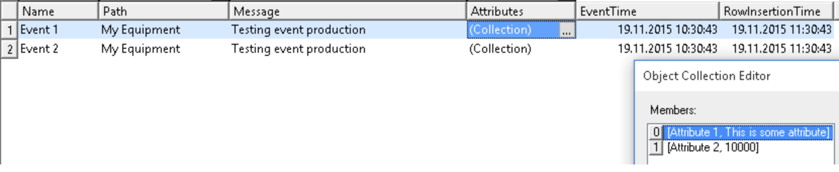 }This produces two events with an event time of one hour behind the current time. You can see the one hour difference between EventTime and RowInsertionTime from the screenshot below.