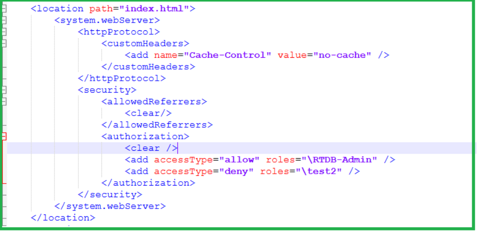 <authorization> <clear /> <add accessType="allow" roles="\RTDB-Admin" /> <add accessType="deny" roles="\test2" /> </authorization> -