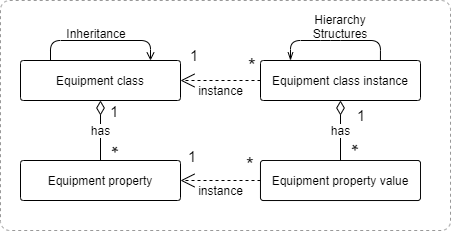 Equipment instances can be organized to multiple hierarchies to describe real word factories, production lines and their subunits, and functional relations. Path is a non-typed equipment instance that is used to create structures together with the equipment instances. Each equipment instance, except the root, has a parent that can be a typed or non-typed instance. Variables can also have parent in the same hierarchy.