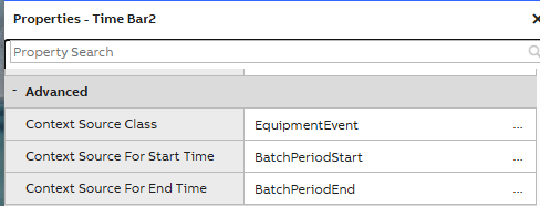 First we make our timebar2 (time bar connected to chart) listen to our datalist widget. This can be done in time bar property settings Listen to Context . Next on our timebar2 settings we will further define Advanced settings as shown below.