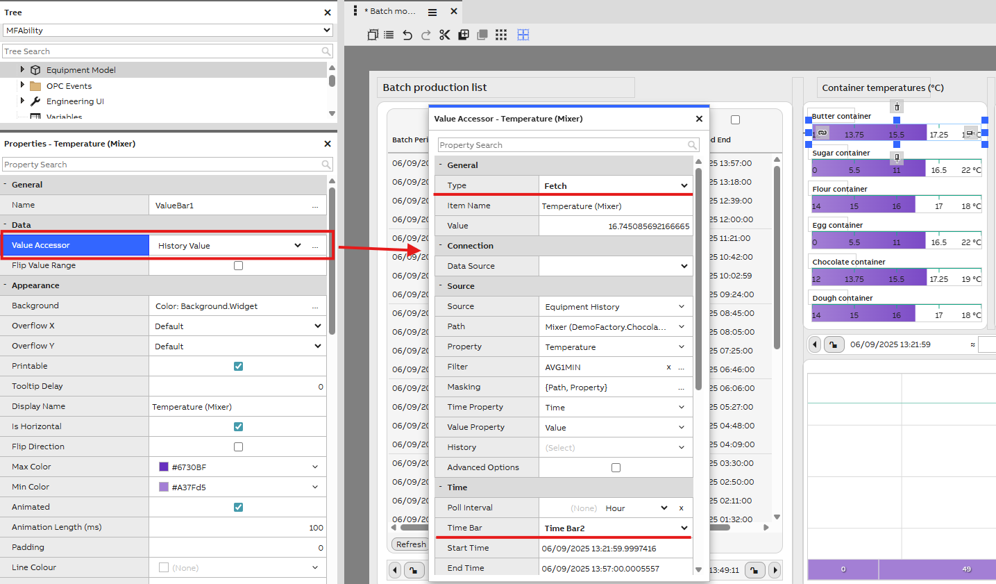 To make our value bars and value widgets listen to batch id changes, we need to configure settings slightly differently. We can open one widget property settings and search for Value Accessor property. For this we select History Value. Now, from the three dots beside this we open further settings and for Type property we choose fetch. This is used when history values are being fetched from database. If we choose subscription here, the widget will not show value as intended. Then for Time Bar property we select our timebar2.