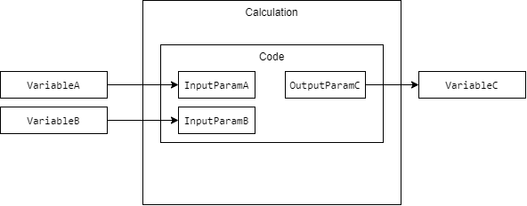 The diagram above illustrates the mapping of time-series into code parameters. In this case, the code can read data of variables VariableA and VariableB from parameters InputParamA and InputParamB, respectively. After calculating the result, the code assigns the it to OutputParamC parameter. This causes the result to be automatically written into VariableC.