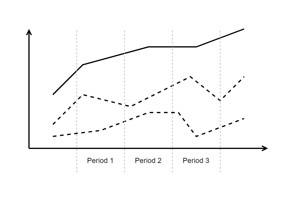 The graph below shows an example visualization of running the code on time-series data. The two input time-series (dashed lines) are summed together to create the resulting time-series (solid line). The calculation period boundaries are also shown.