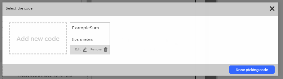 If you've completed Part 1, the code selection dialog will appear. Select ExampleVolume from the code selection dialog and click Done picking code.