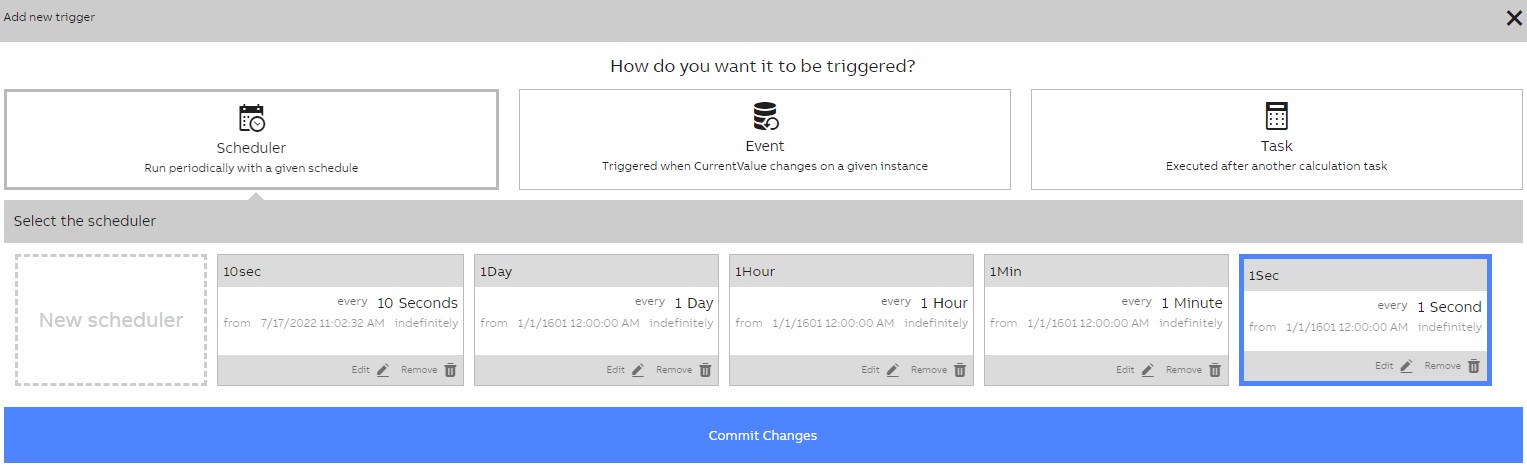 We have now created the code for your calculation and mapped data to it. The final thing left to do is to tell the calculation when it should run. We'll configure your calculation to run every second.