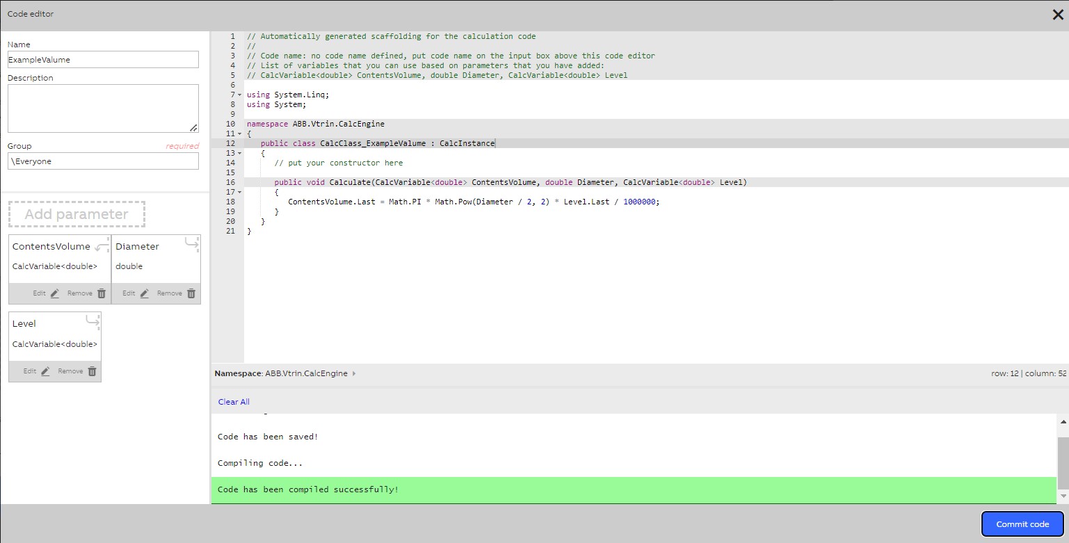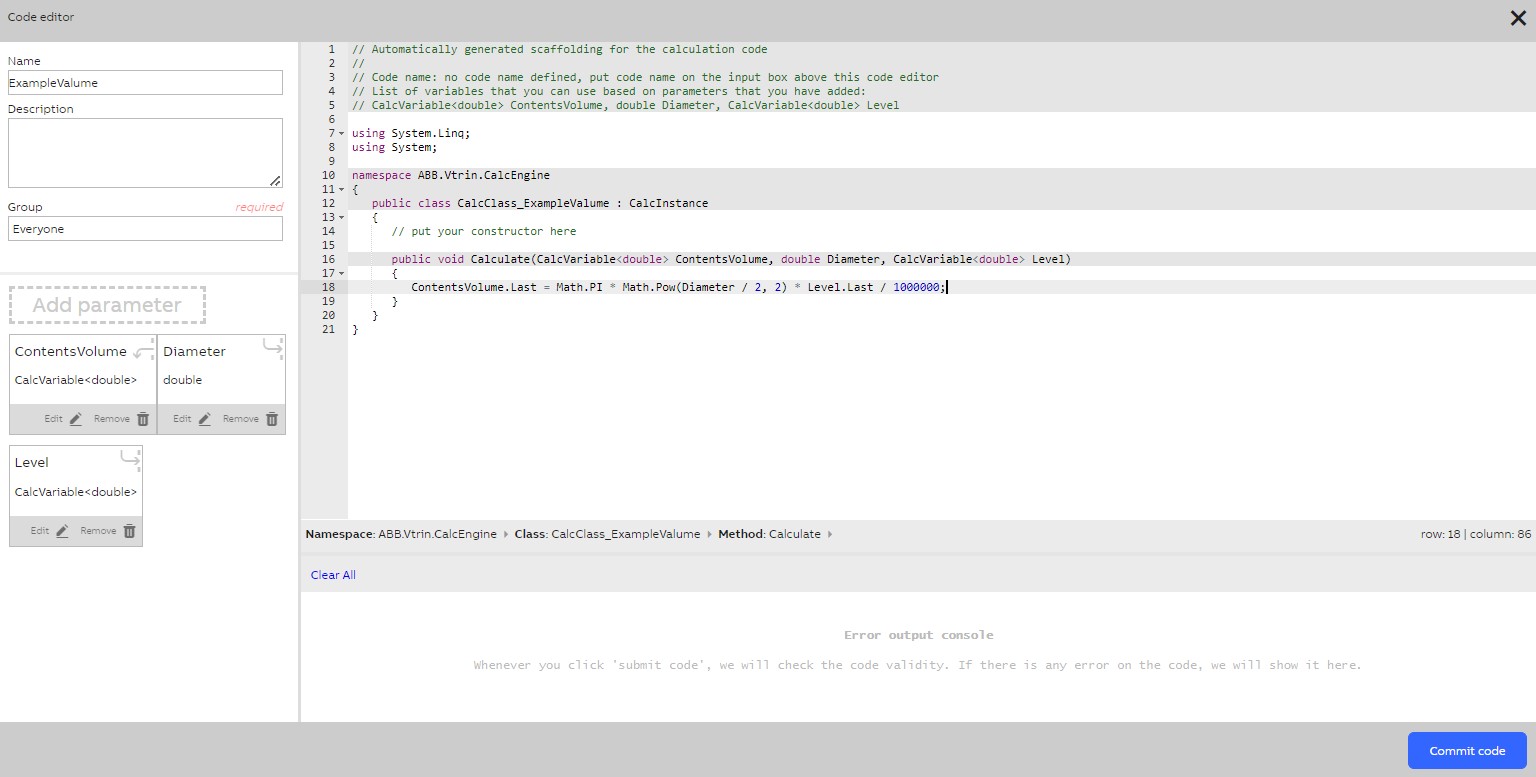 ContentsVolume.Last = Math.PI * Math.Pow(Diameter / 2, 2) * Level.Last / 1000000;Your code editor should now look like this: