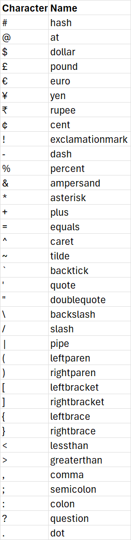 Not all special characters will automatically be replaced with its simple name, non common characters will instead be replaced with its hex code. So, for example, if your equipment name is "myEquipment™" it will be replaced with "myEquipment_x2122_". Below is the list of all the special characters that will be replaced with its English name: