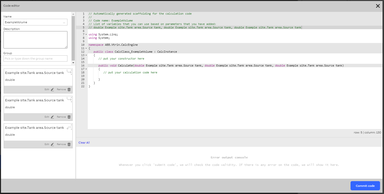 Note about equipment with special characters in their nameCalcEditor will automatically escape special characters in the equipment name and/or equipment properties name with replacement string with this pattern _, except for space character, which will be escaped with double underscore (__), so if your equipment name is "My equipment@plant1", the type name for that equipment will be escaped to be like this "CalcEquipment_My__equipment_at_plant1". Note that if the special replacement strings are used in original names, conflicts can happen. So for example, if you are using two equipment in your code with these 2 names: My equipment and My__equipment, this will result in conflict. You need to change the name of one of your equipment.