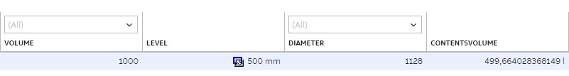 where V is the volume of the cylinder, d its diameter, and h its height. You may notice that the unit for ContentsVolume is m3, which differs from that of Level and Diameter, which is mm. Therefore, we also need to divide by 1000000 to get the units right. Substituting all this into the formula above, we get the following final form: