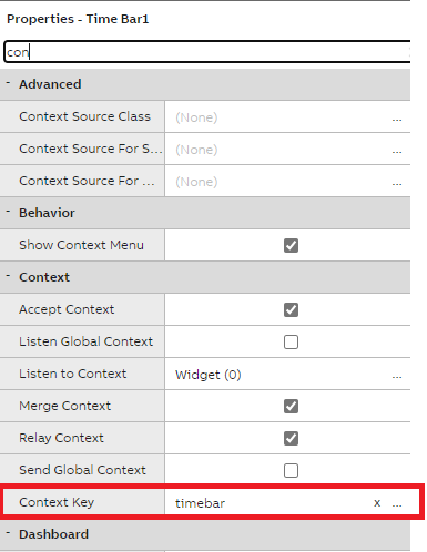First we need to create a context key for Time Bar widget in our main dashboard. This may be done on the Time Bar widget properties under Context section as shown in the below screenshot.