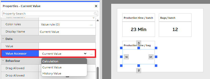 - In the properties window for the Value3 widget, select the Calculation option for the Value Accessor.