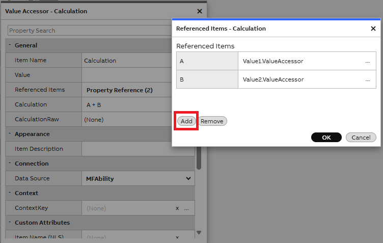 - Add values by pressing "Add" and selecting the values you added earlier, value1 and value2. A and B represents the chosen values.