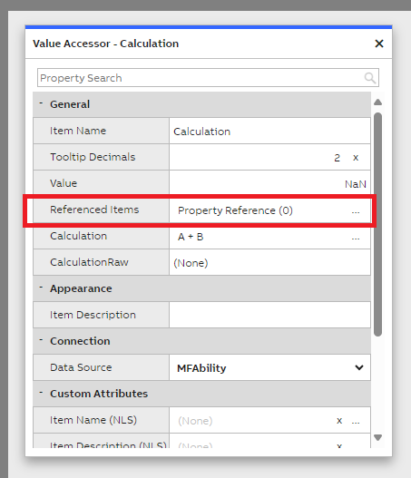- Add the values that will be used in the calculation to the Referenced Items as pictures show below. Click the three dots next to the Referenced Items row to open popup.