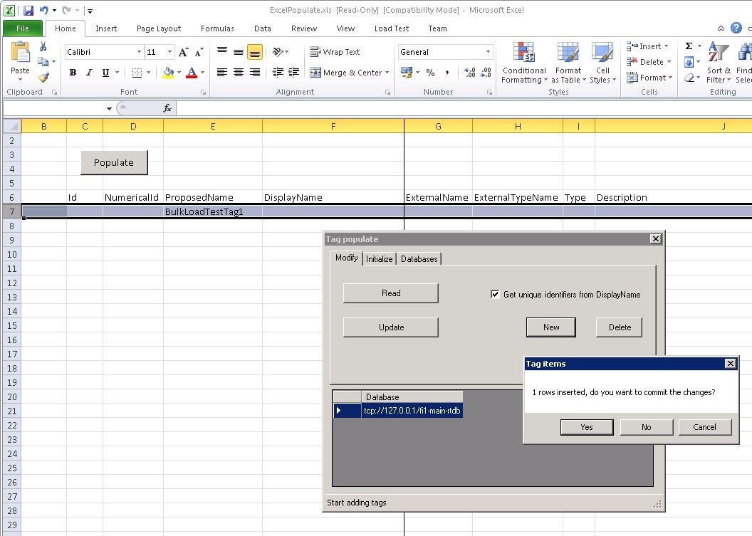 There are three tabs in the populate dialog: the "Modify" tab is used to create or delete tags, and to fetch or modify the existing tags. The tag bulk-load tool is bi-directional, and its user should always remember that History database is a master for the configuration, and the Excel sheet is only one application to access that information.