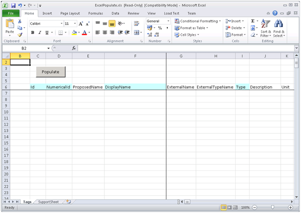 There are two sheets visible: "Tags" and "SupportSheet". The support sheet only contains some internal configuration information and should be automatically populated correctly at the startup. The most important information in "SupportSheet" is the "dll directory" that should point to %APP_DATAPATH%\VtrinShared\XL. Usually, the user is not required, and shouldn't, modify the data available in "SupportSheet". The top-most sheet is "Tags", which is the place where bulk-population is done.