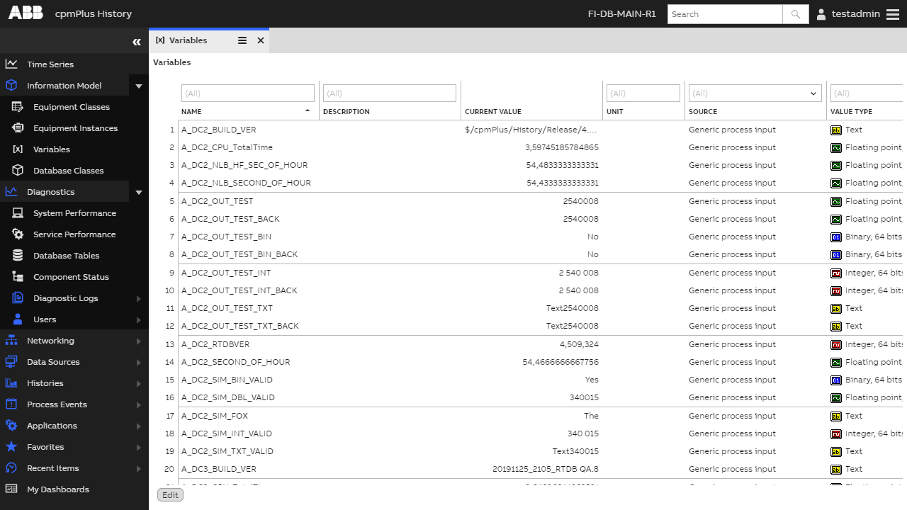The Variables list is available from Engineering UI. To find them, select "Configuration" > "Variable Definitions" from the left side navigation panel. Variables can be created using the list functionality (From edit mode "New" > "Commit"). The selected Tag's properties can be seen on the column on the right.