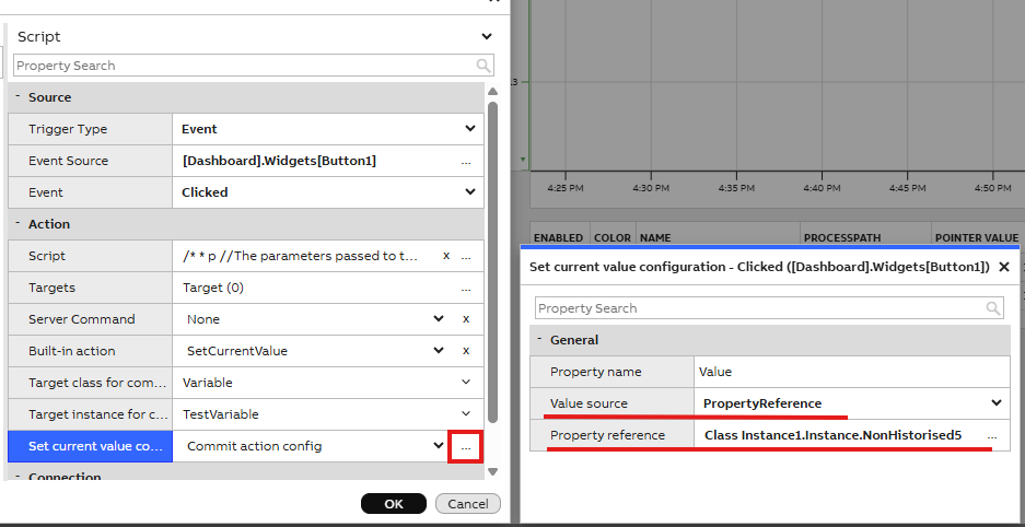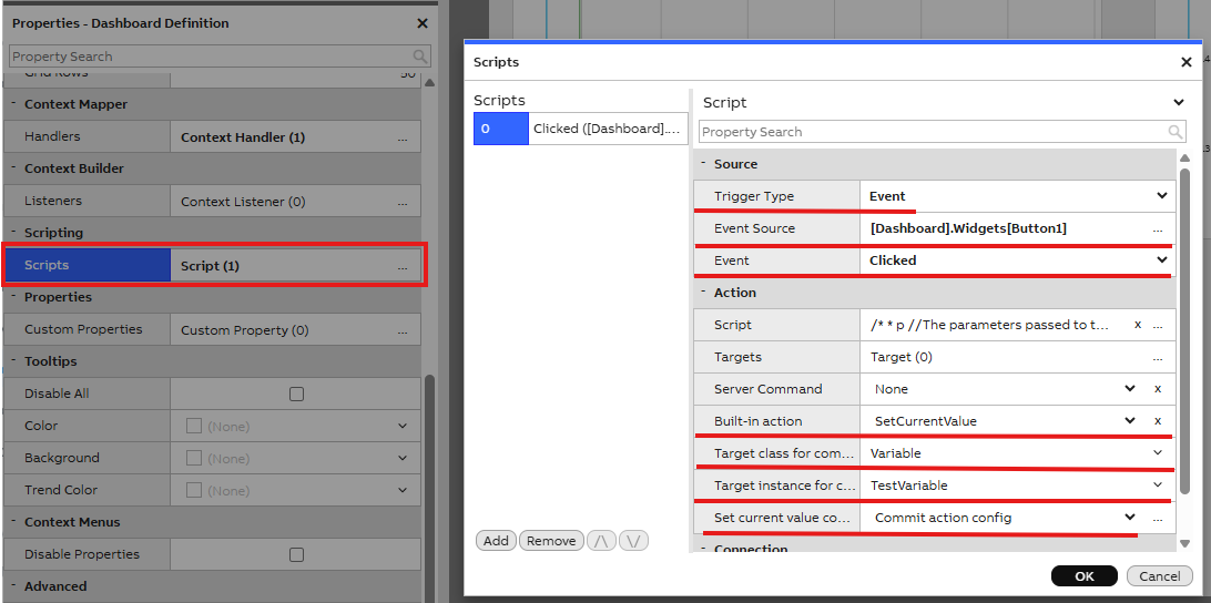 - Event Source: : Select a Button widget from the dashboard (in the example there is a button named 'CommitButton') as the source.