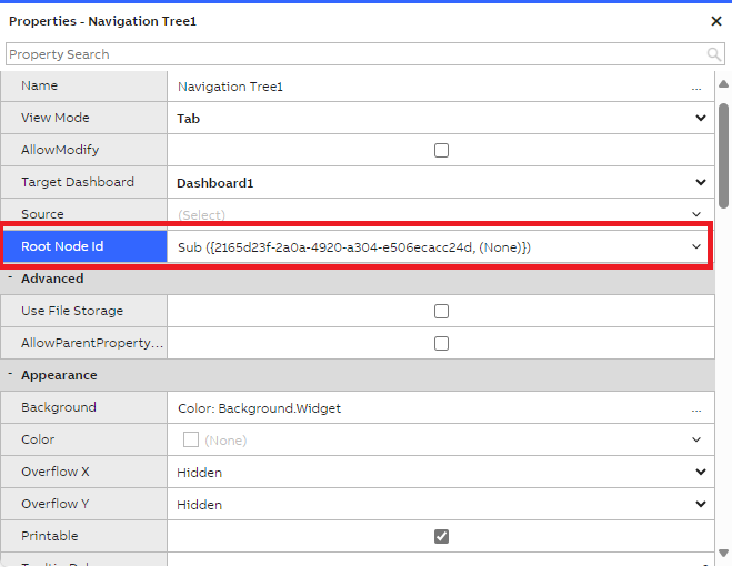 In the Navigation Tree widget properties search for the folder name and select root node ID as Sub Dashboards folder path ex: 'Sub' as shown in the below screenshot.