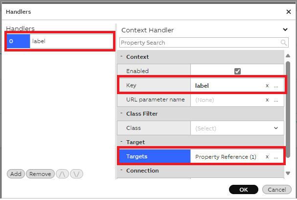 In both sub dashboards add a context handler in the dashboard properties with key as 'label' and target as 'Label Widget' as shown in the below screenshot. So that incoming context from the Main Dashboard is handled.