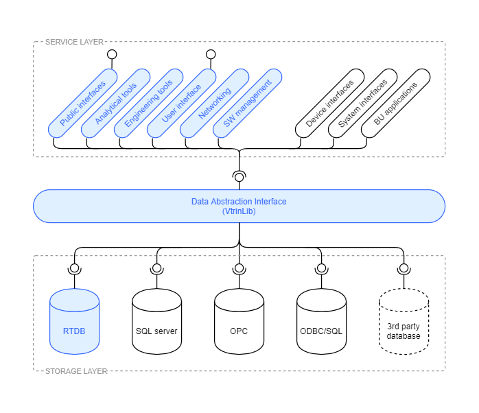 The picture above visualizes the purpose of VtrinLib. By providing a common interface, VtrinLib makes it easy for clients to connect different data sources. Any service layer service can be connected to any storage layer data source via the same VtrinLib interface. In addition to the data abstraction, VtrinLib provides multiple functionalities to cyber security and handling of time series data such as online aggregation, unit conversion, and National Language Support (NLS).