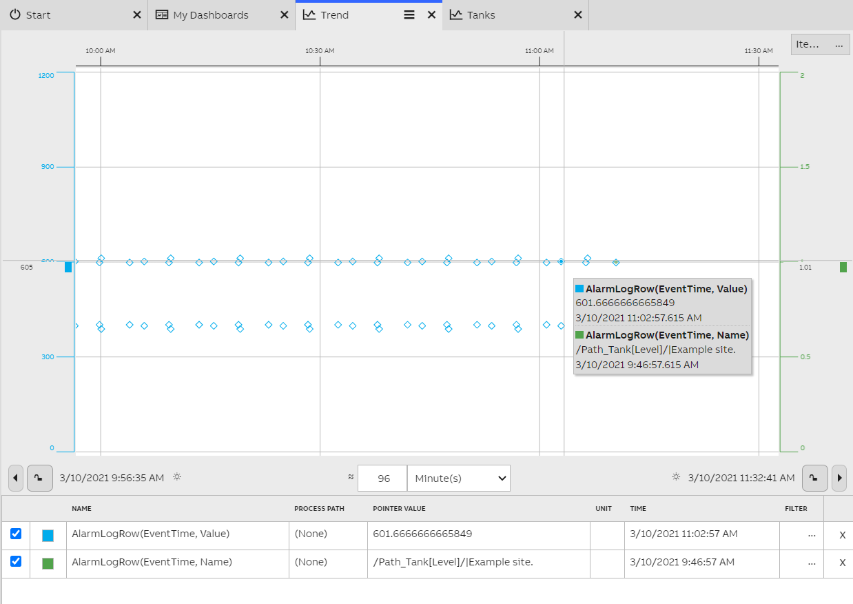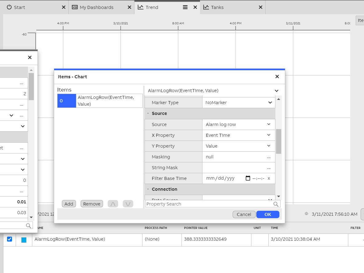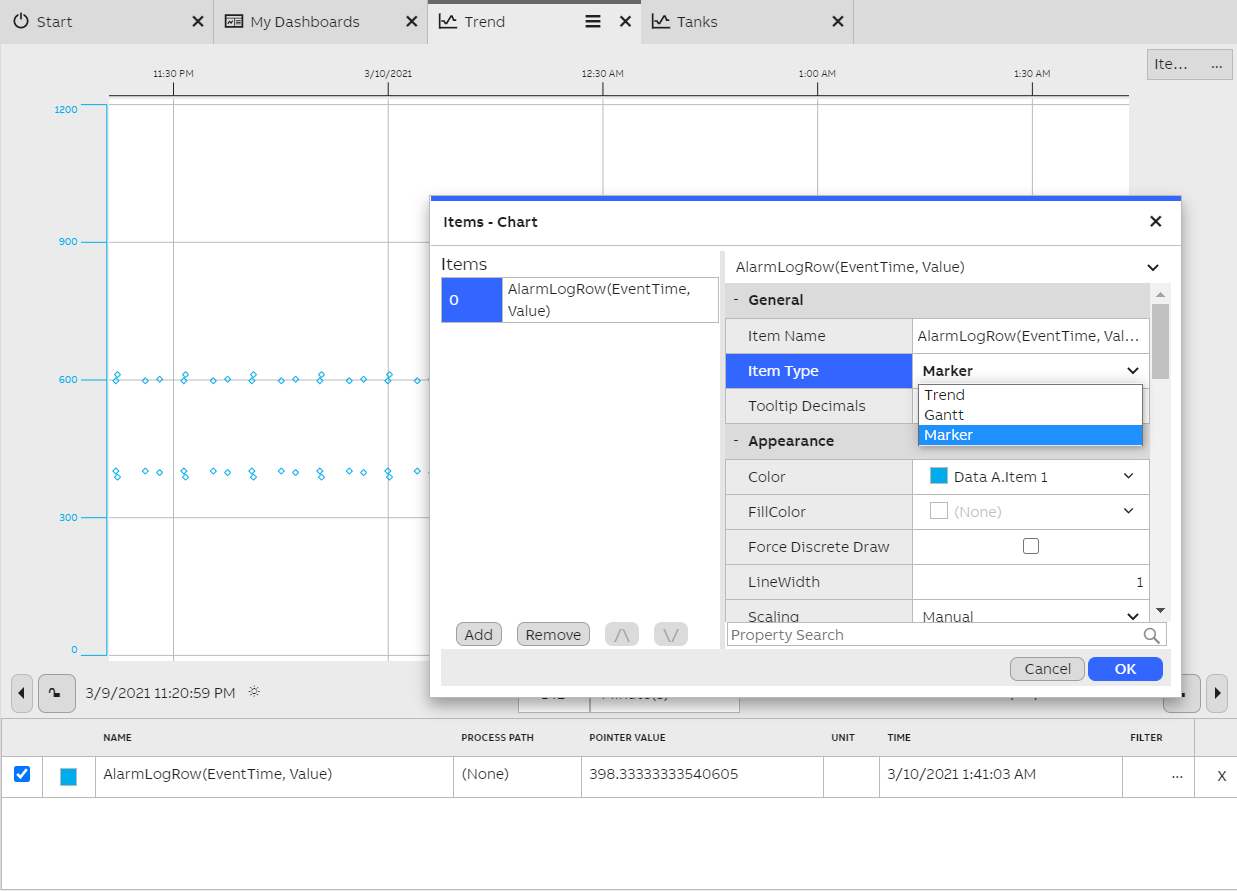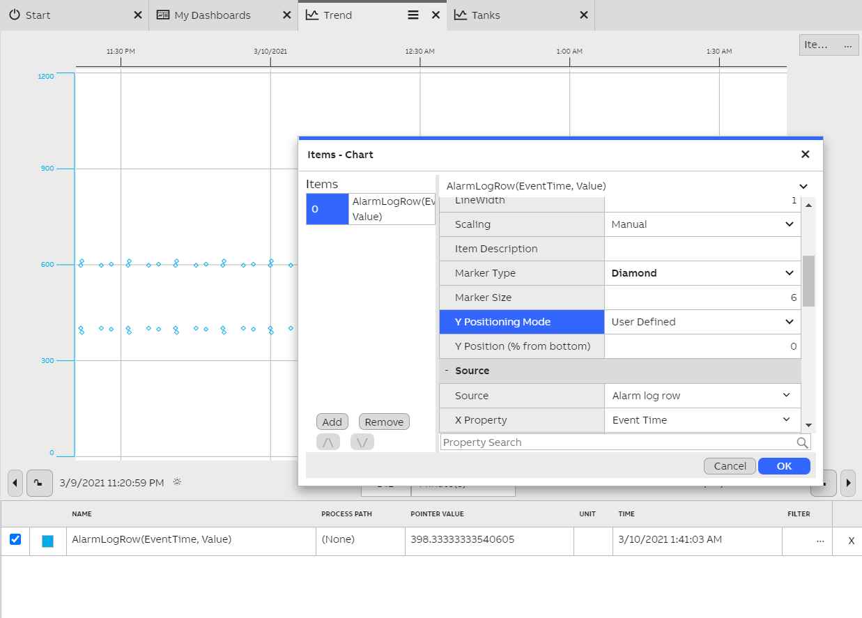 First, add event data onto the trend by creating a new item. This may be done on the single property editor menu. To display alarm log rows, change the source to "Alarm log row". Set the X Property as "Event Time" and Y Property to "Value". The markers are positioned on the trend according to these properties.