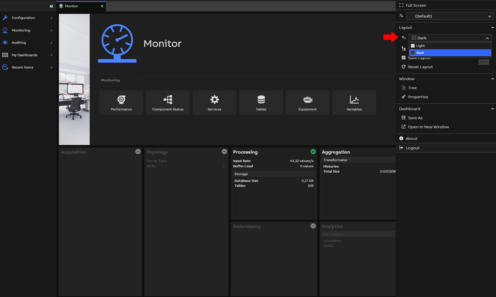 To change your Engineering UI theme, click first icon under "Layout". Engineering UI has two themes, light and dark.