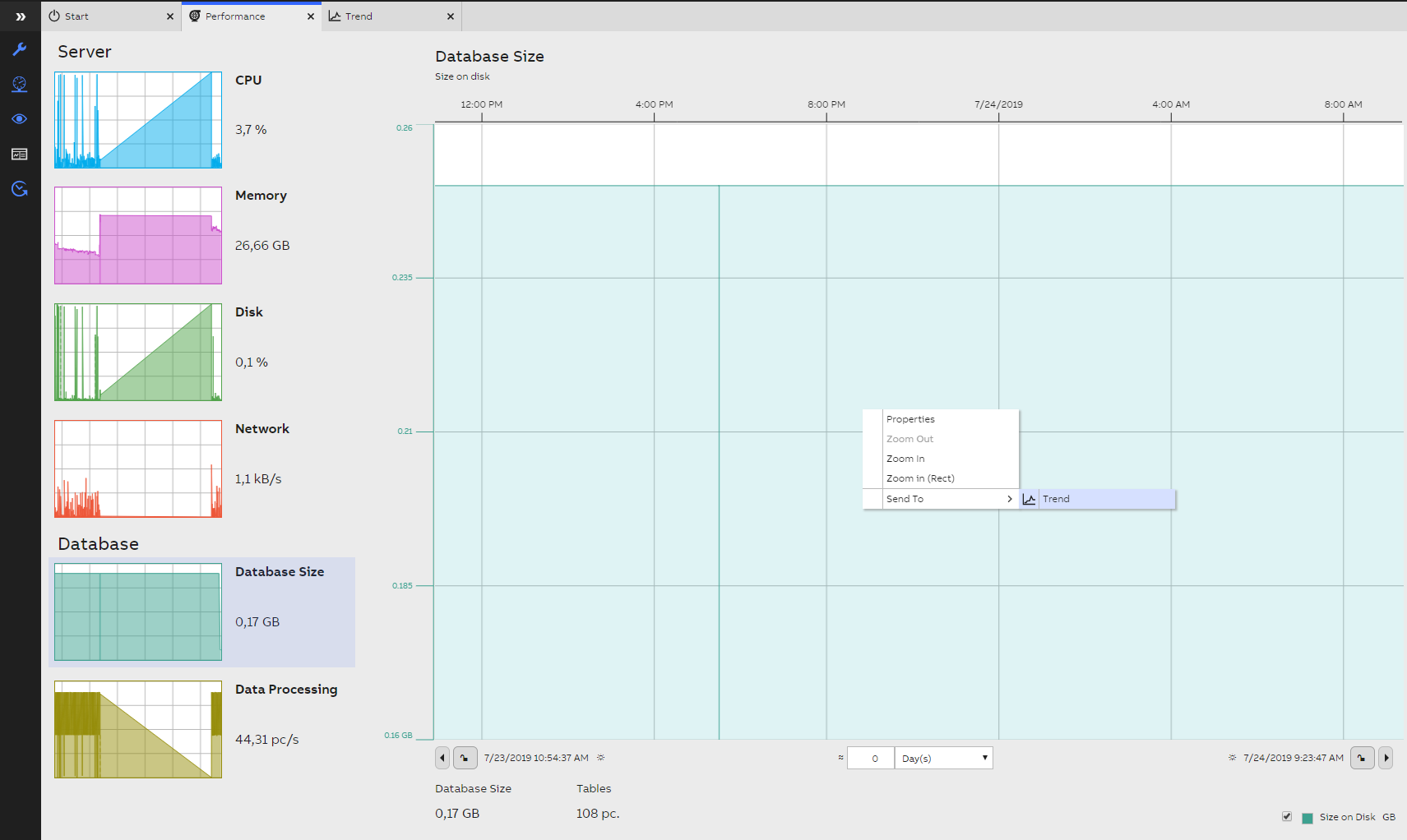 Next, you want to send the data from database size to a separate trend chart. Click "Database Size" thumbnail, and right click on the trend chart on the right. Choose "Send to" and then click on "Trend".