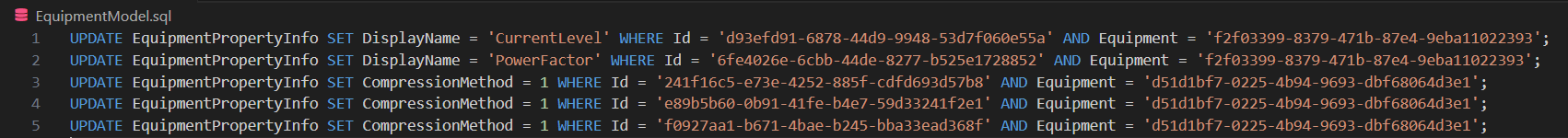 UPDATE EquipmentPropertyInfos SET Attribute='New Value' WHERE Mask(DisplayName[Name]/Id) = '' AND Equipment(EquipmentId)='';