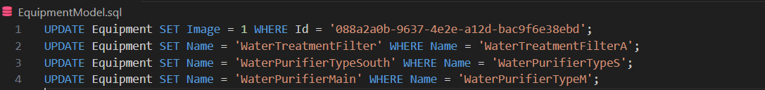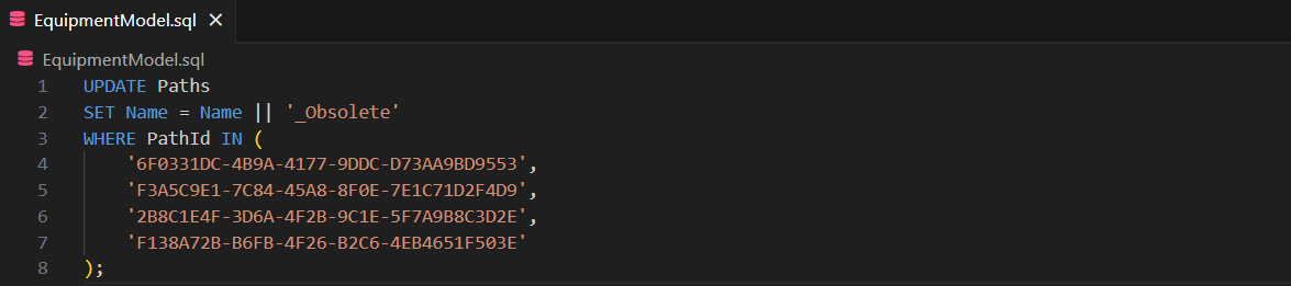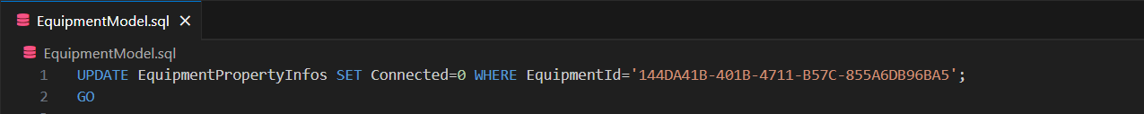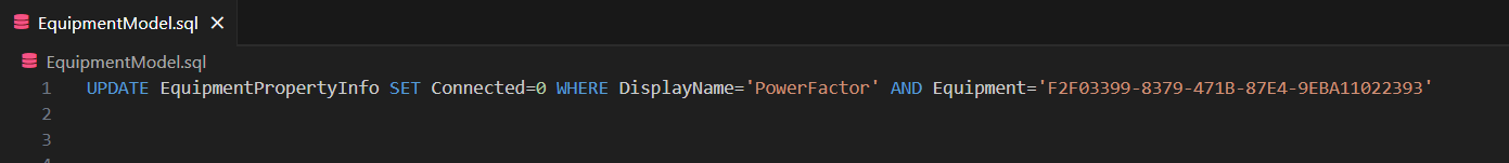 UPDATE EquipmentPropertyInfos SET Connected=0 WHERE Equipment(EquipmentId)='';