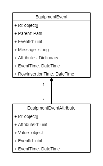 It is up to each OPC A&E server to decide what kind of vendor-specific attributes it exposes. This is why a separate class (table) for the vendor-specific attributes is needed. Each OpcEvent instance is referring to zero or more OpcEventAttribute instances.
