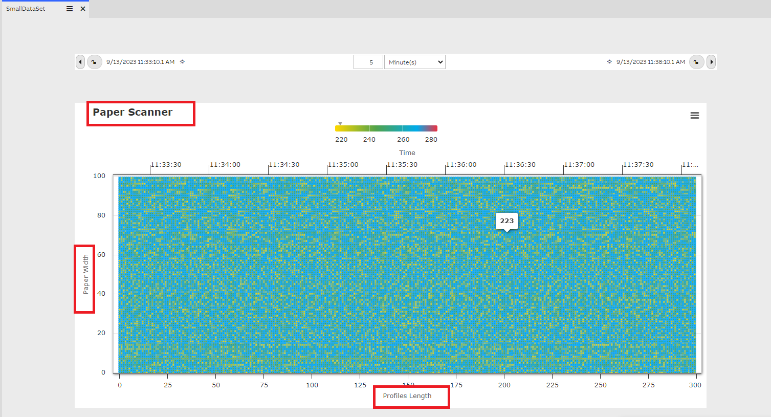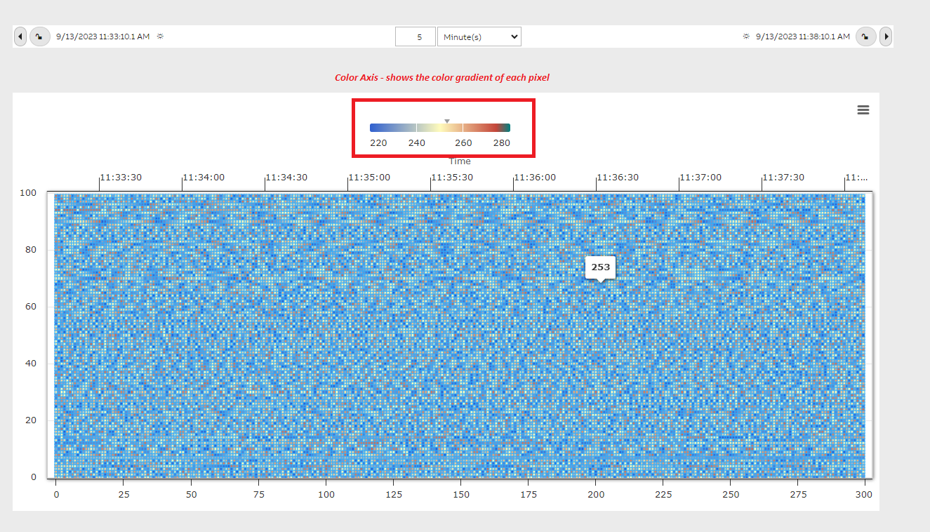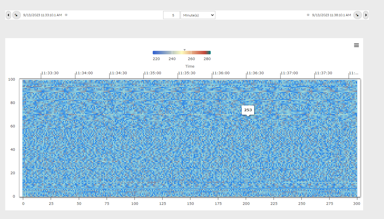 Each pixel or box in the heatmap widget represent the actual value from the Equipment Property and the color of each box is determined by the color gradient as shown in the Legend at the top of the widget. Minimum and Maximum values in the array are determined and the default color gradient is applied automatically. Also when user places mouse over any pixel the value of that pixel/box is shown as a tool tip. In the below heat map we have 300 profiles on the X-Axis and 100 points on the Y-Axis i.e. totally 30,000 heat points are plotted over in the area of the heat map widget.