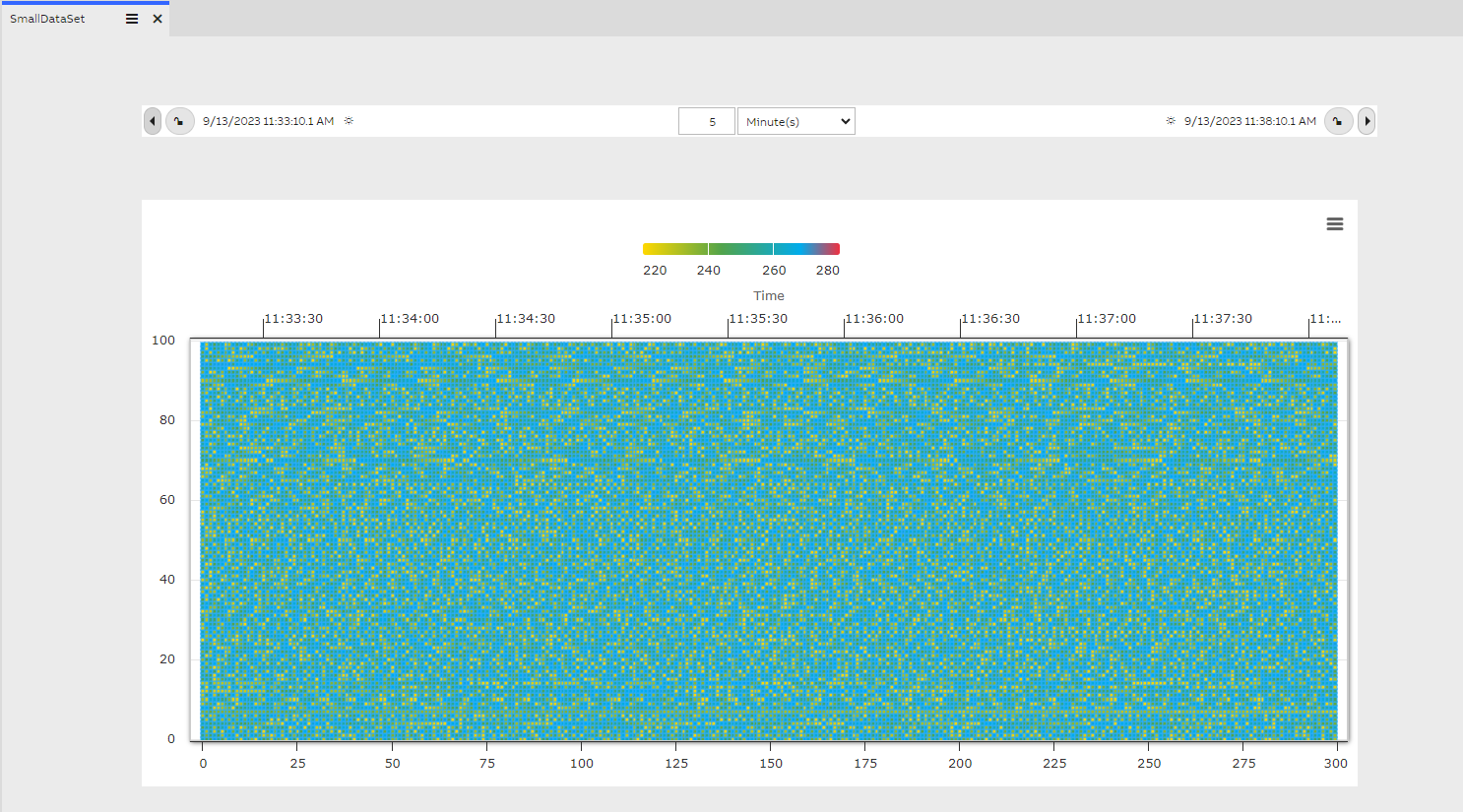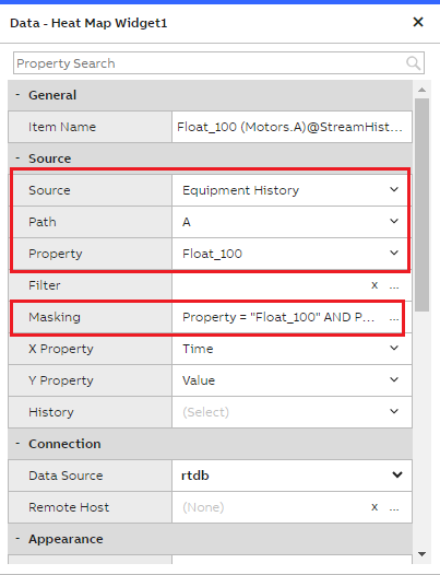 Property: Float_100 (This is of Float 64 bit array data type and the data updates for every 1 second, the heat map best works with Array data types)