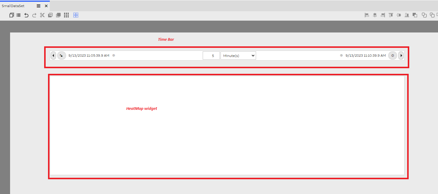 Drag the HEAT MAP widget to the dashboard and resize it to Height as 500 and Width as 500 (this is just for an example, user can select the desired height and width based on the data size for plotting). And also drag and drop a timebar widget from 'controls' section