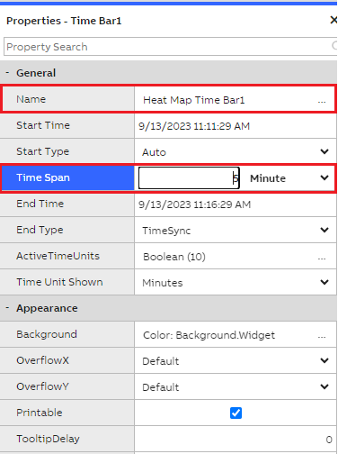 Give a name for the Time Bar as 'Heat Map Time Bar 1' and set the Time Span as '5' Minute (as we wanted to get small data set for the heat map plotting). And also disable the time synchronization to avoid automatic data refresh.