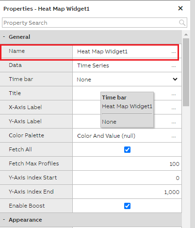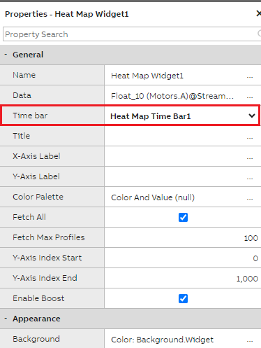 Next, in the Time Bar dropdown select 'Heat Map Time Bar 1' as heat map widget needs to be linked with Time Bar widget to fetch the data for the duration selected.