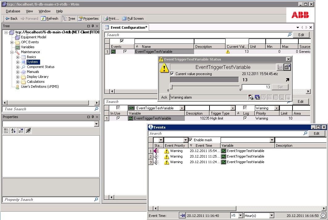 The easiest way to create event triggers is by using Vtrin. The "Event Configuration" list is found from the main tree in Maintenance\System\Events and Alarms. In the following example, a new variable, "EventTriggerTestVariable" is created. It is used to generate events whenever the current value of the variable becomes greater than 10.