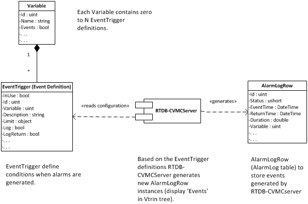 OPC Events and external events, as described in External events, provide means to store events collected from any third-party system that supports the OPC A&E server interface. Contrary to this, internal events are events that are generated based on numerical data collected to RTDB. Event generation is controlled by creating event triggers ("EventTrigger" Vtrin class). The following sections give detailed information on how to use and understand available events, as well as how to create new event triggers to spawn new internal events.