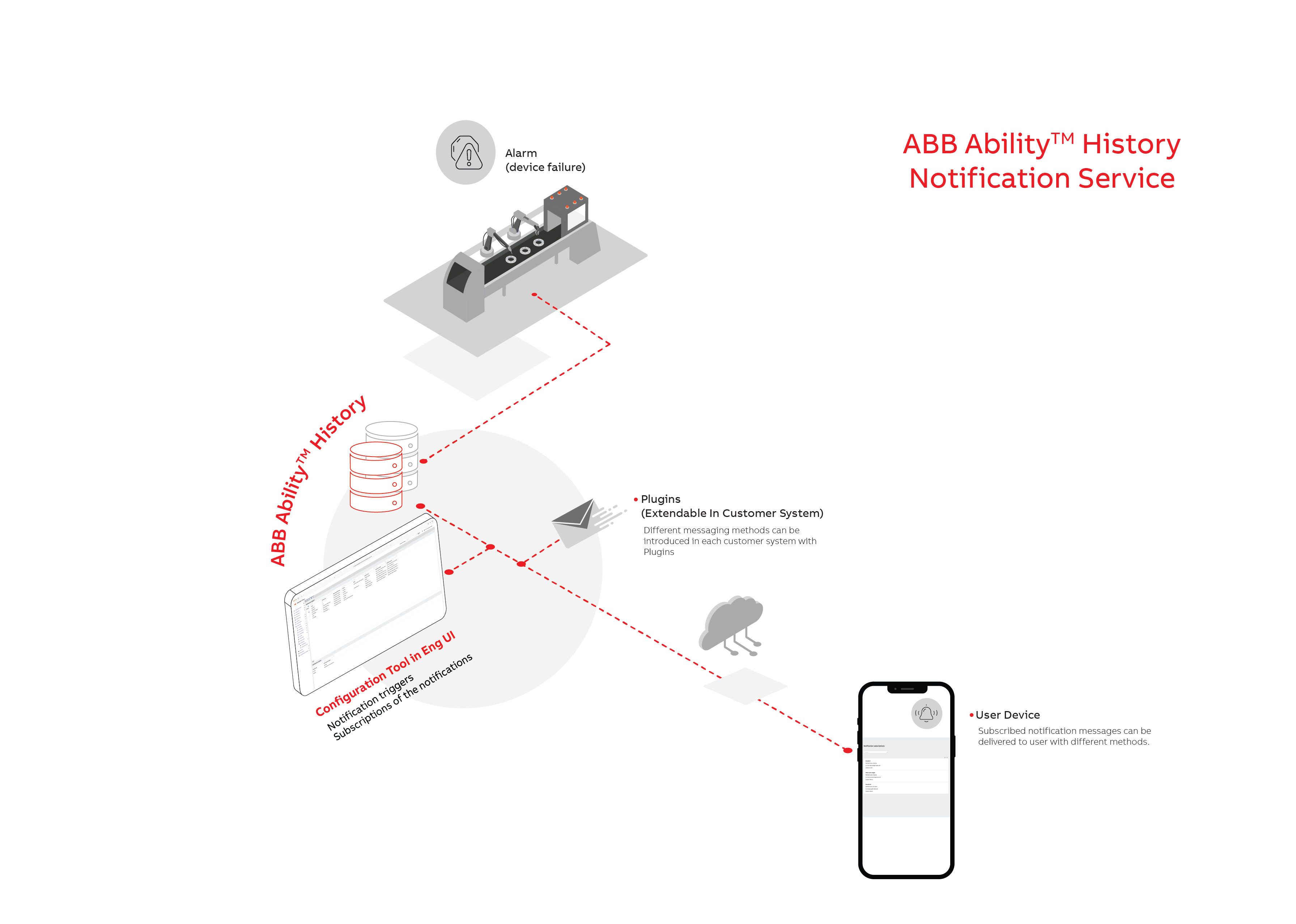 The picture below gives an example of the Notification Service. A device failure occurs in the factory production line and this causes an alarm that is collected by ABB Ability™ History with OPC UA. With engineering UI, a user with admin rights can define a notification to be triggered from the particular type of alarm, and the format of the content of the notification to contain relevant information such as device ID and description of the failure. Users interested in this notification can subscribe to it to be delivered to them with a chosen method, such as email, signal, or other. Please note that the Notification Service is for instant messaging, and it does not store the notification messages.