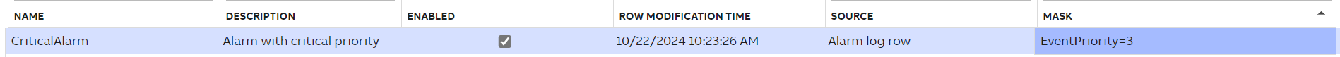 Use case 1: A user who wants to receive a notification when there is a new alarm with priority Critical could create a NotificationTrigger with Alarm Log Row as Source, and set the Mask as following "EventPriority=3". Any Alarm Log Event that does not have EventPriority level 3 (Critical) will be filtered out and does not set off the Trigger.