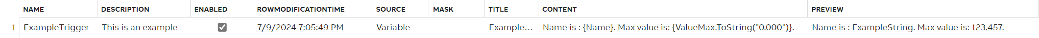 The message being sent out will have the title "Example Message". In the Content of the message, the part {Name} will be replaced by the name of the instance ( in our case "AddedVariable",) and the part {ValueMax.ToString("0.000")} will be replaced by the value in the Max column (15.34) with the format "0.000".