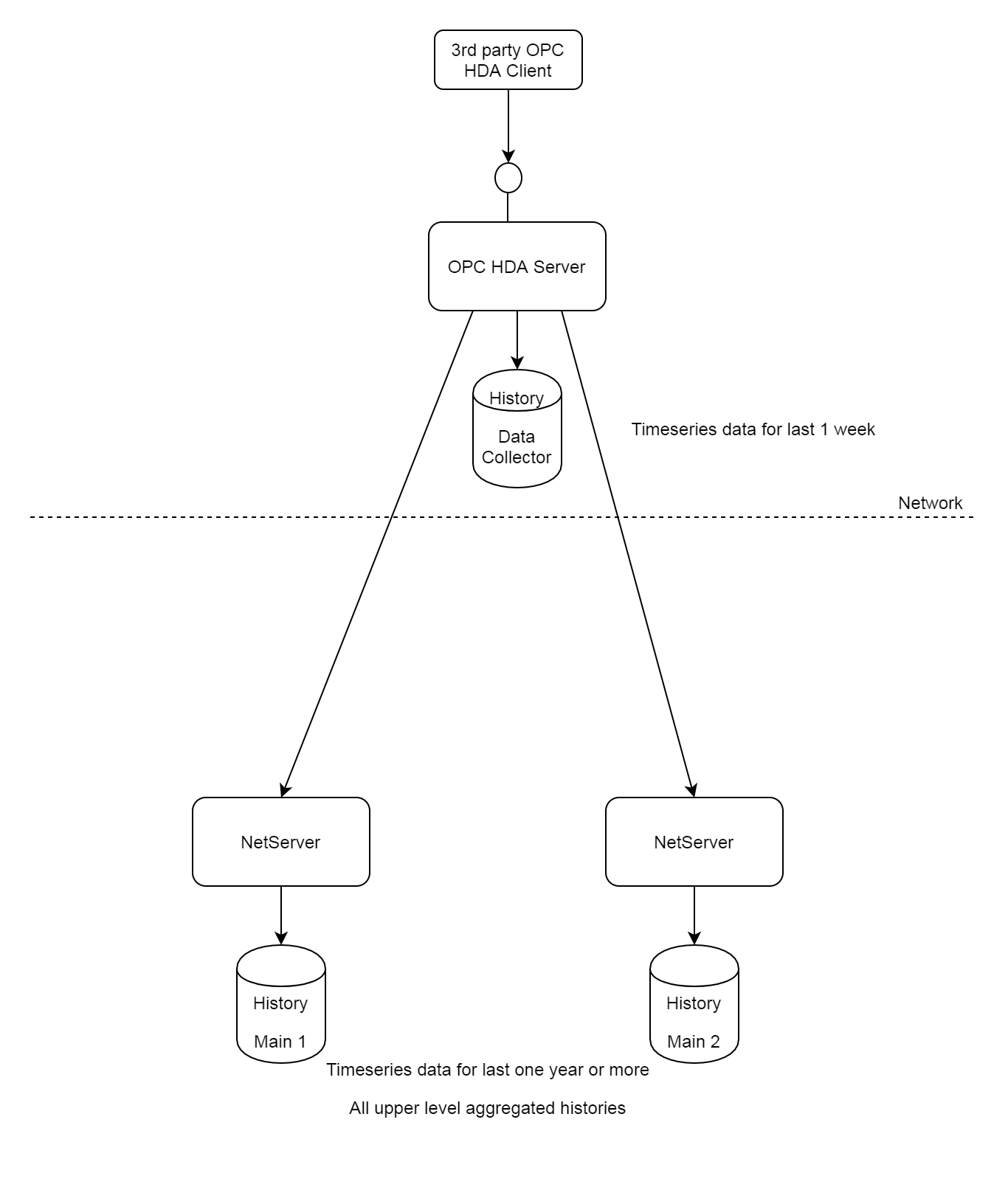 Other important deployment for HDA server is a special setup in hierarchical system. HDA server in data collector node having the prog id ABB.CpmPlusKmOpcHdaServer is set up to connect both localhost and Main node as well. In case Main node is redundant, HDA server connects both servers separately. Functionally server is always able to get last 8 days of data from locahost and for longer queris it goes to MAIN nodes in case network connection is good. This behaviour is called seamless HDA server.