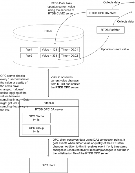 The cache of the OPC DA server reflects the values, qualities and timestamps similar what exists in database and events are not generated if only the timestamp of the item changes. This leads to overall behavior where many OPC clients, which are using DA2 connection points to monitor data changes, show a different timestamp that can be seen e.g. by using the Vtrin user interface. This feature of the OPC DA specification can be overridden by setting the initialization parameter SendEventIfOnlyTimestampChanges of the RTDB OPC DA server to 1 (true). This forces the OPC server to send events as well, if only the timestamp changes. This kind of behavior can enhance the overall system usability many times.