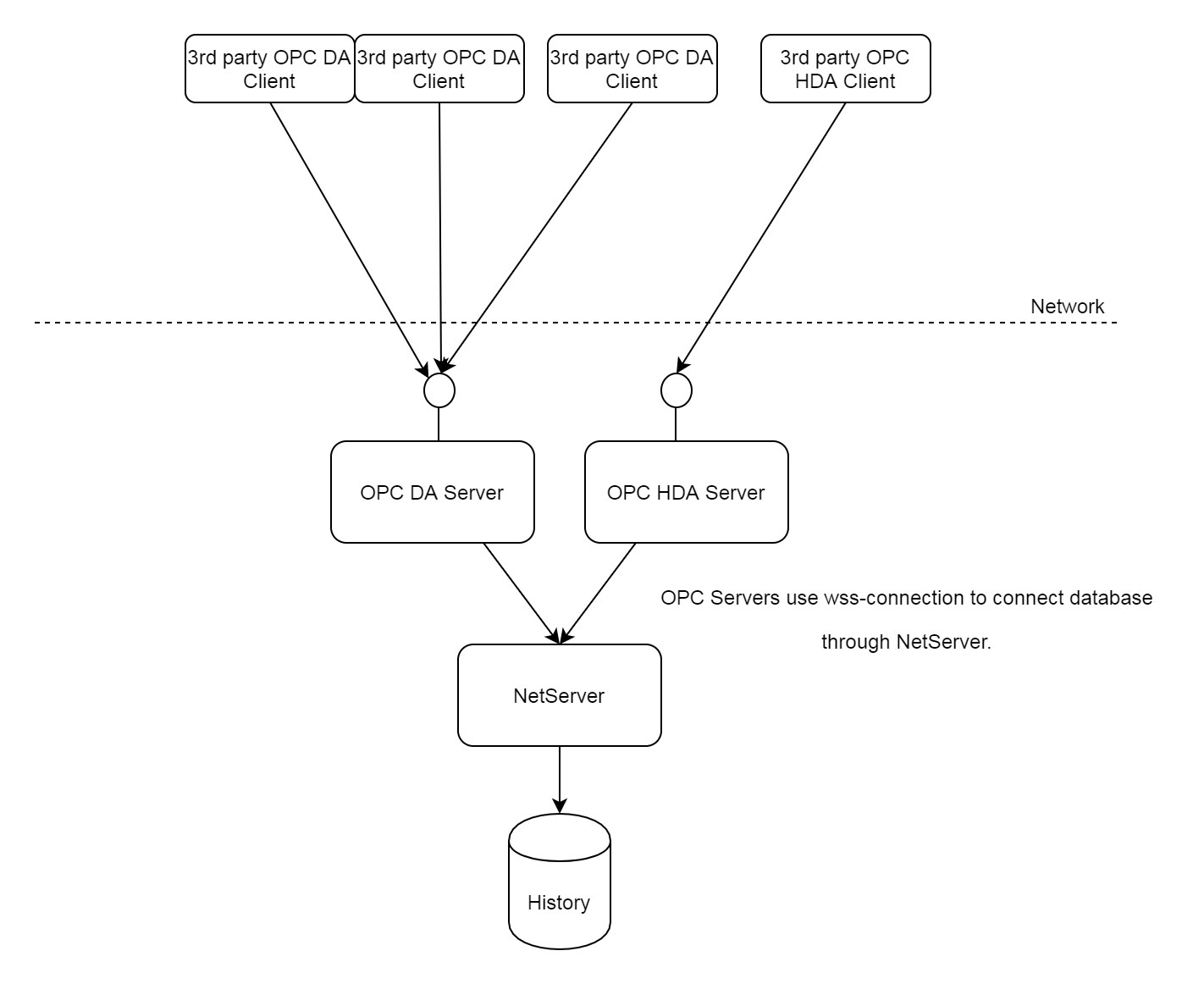 History OPC servers run as services that can be located either in the same computer where History is running in, or in a different computer than where RTDB is running. In both cases, OPC servers use the VtrinLib data abstraction layer to establish a device connection to History. Two network connections can be between OPC client and History.