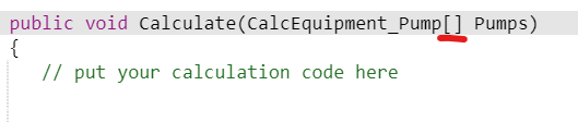 In the code editor, the Pumps parameter would then be presented as an array of CalcEquipment_Pump like below:
