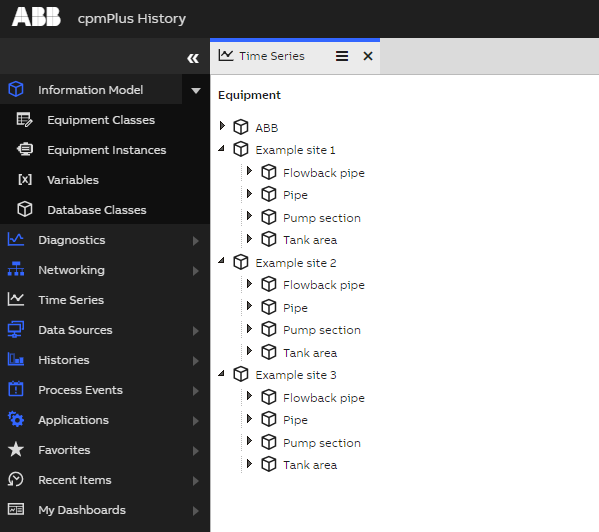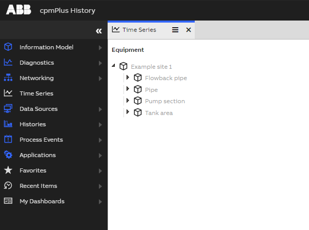 If we now log in as Operator, we can see that only Example site 1 is visible in the equipment hierarchy: