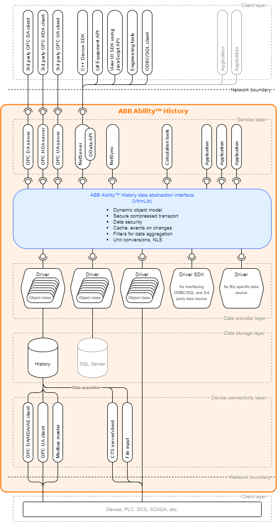 The service layer provides external APIs to ABB Ability™ History and services that are needed to implement applications and end customer solutions. External APIs contain OPC Server APIs (classic DA and HDA, and UA), OData, ODBC SQL, and VtrinLib .NET API. Details can be found in External interfaces. Other services contain e.g. Calculations and services to System architecture and topology.