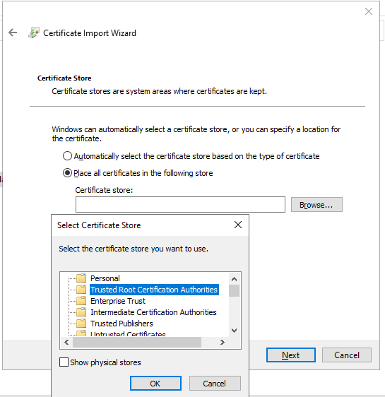 In the next screen select the option Place all certificates in the following store → Browse → Trusted Root Certification Authorities and click OK and Next