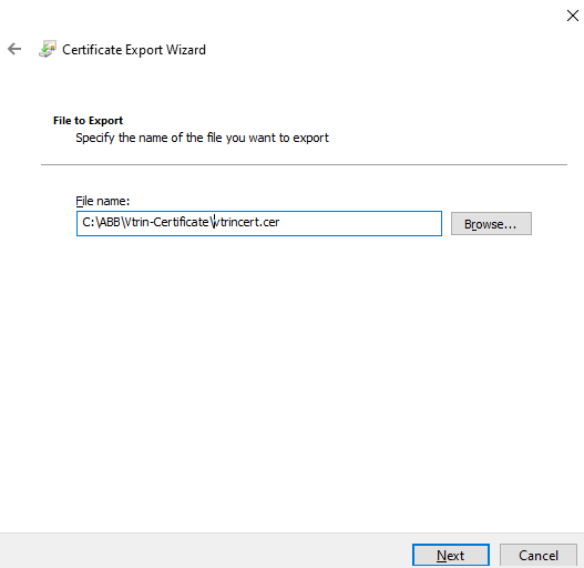 Provide a Path and filename so that the *.cer file is generated in the given path with the given name and click on Next